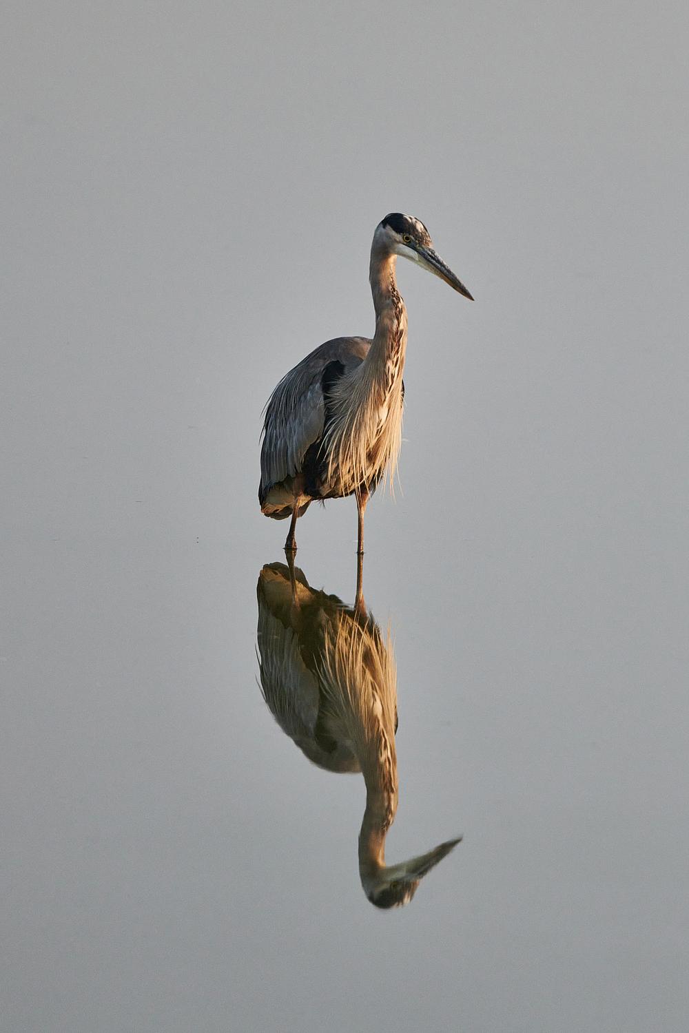 A solitary heron stands gracefully in shallow water, creating a perfect reflection on the calm, mirror-like surface. The serene scene captures the bird's elongated neck and legs against a minimalist backdrop.