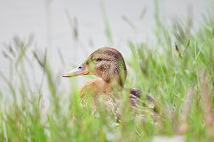 Little Mallard resting near water.